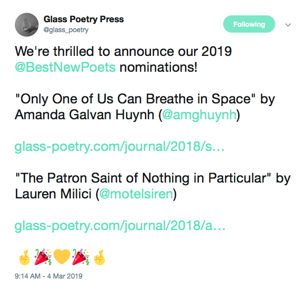 *Some people use the Literistic email service. On top of literary journals to submit to, this group also includes residencies, fellowships, and grants. I do not subscribe to the long list ($5/a month — I believe) but I think I’m linked to the short list.